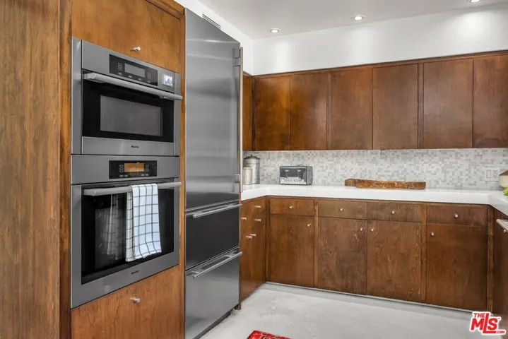 Designed by renowned architect James W. Larson, AIA, in 1957, this classic mid-century architectural retreat is privately set in the Encino hills on over half an acre of serene, natural surroundings. The residence beautifully embodies the defining elements of mid-century design clean horizontal lines, expansive walls of glass, seamless indoor-outdoor integration, and an effortless sense of elegance and flow.A lush front courtyard welcomes you to a dramatic double-door entry, opening into a refined living environment highlighted by hand-polished cement floors, rich hardwood accents, a striking stone fireplace, Fleetwood doors, and expansive floor-to-ceiling and clerestory windows that bathe the home in natural light. The spacious kitchen offers abundant wood cabinetry, quartz countertops, and premium stainless steel appliances by Miele and Wolf, combining functionality with modern sophistication.The resort-style backyard is ideal for entertaining and relaxation, featuring beautifully landscaped grounds, a saltwater pool, sundecks, a covered patio, and a tranquil hillside meditation and yoga studio. This exceptional property is a rare fusion of architectural artistry, timeless design, and elevated indoor-outdoor living.