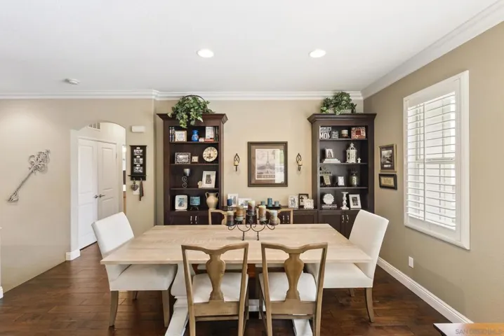 Beautifully maintained 2-bedroom, 2-bath residence in the sought-after Cypress Greens community of Carmel Mountain Ranch. Built by Shea Homes in 2008 and owned by the original buyer, this top-story end unit is positioned above the garages with no units below and windows on three sides, creating exceptional privacy, natural light, and a layout that truly lives more like a single-family home. Inside, the thoughtfully upgraded living space features hand-scraped distressed engineered hardwood flooring (see suppl) throughout the main living areas, bedrooms, and kitchen. The kitchen is both stylish and functional with stainless steel appliances, including a recently installed quiet-run dishwasher and microwave, quartz countertops, and a convenient two-seat eat-at bar. A custom built-in storage and shelving feature adds character and smart functionality to the dining area. The living room is anchored by a wall of southeast-facing windows, dressed with plantation shutters that flood the space with beautiful morning light, while the fireplace creates a cozy place to unwind in the evenings. Step outside to your private patio, with direct access from both the family room and the primary suite—ideal for relaxing or entertaining. Additional highlights include a security system, a direct-access one-car garage with overhead storage racks, plus a deeded surface parking space, offering two total parking spots. Ideally located directly across from the community pool, spa, and outdoor gathering areas, this home also enjoys NO Mello-Roos taxes, easy access to shopping, dining, and major commuter routes, and all the benefits of Carmel Mountain Ranch living.