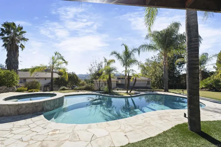 An entertainer’s dream with commanding views and a waterfall pool retreat you won’t want to leave. This spacious home sits on over half an acre and features an open layout with a large, open kitchen perfect for anyone who loves to cook without feeling cramped. A downstairs bedroom and bath provide added flexibility. The primary suite offers sweeping views, dual walk-in closets, and an updated bath. The backyard delivers full resort living with a sparkling pool and spa, custom waterfall feature, outdoor kitchen, and putting green, all set against panoramic sunset views. Three-car garage with room for toys, storage, or workspace. Located in the San Diego Country Estates near parks, trails, and community amenities. A rare combination of privacy, space, and true resort-style outdoor living.