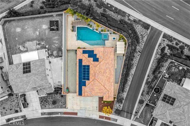 One of the standout features is the owner-paid solar system with whole-home battery backup, designed to significantly reduce utility costs while offering added peace of mind. The backyard is equally impressive, complete with a sparkling pool featuring water elements, a built-in BBQ area with seating, and a firepit for relaxing evenings.