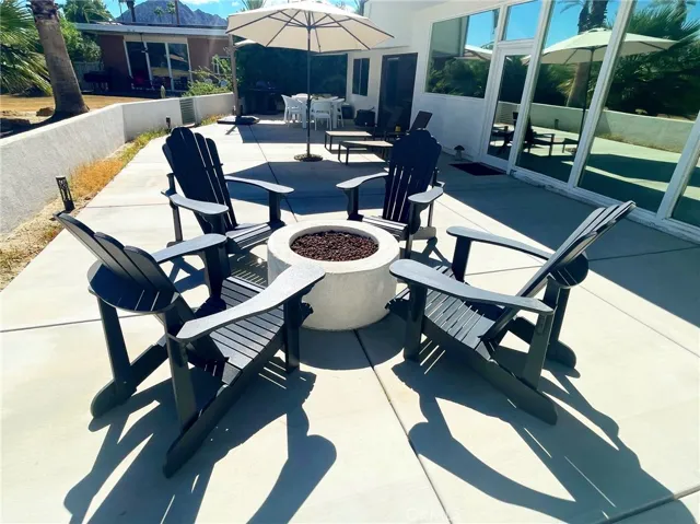 The private rear patio with fire pit creates the perfect desert lounge setting, while the unique community layout places the rear of each home facing an expansive greenbelt with a sparkling community pool, palm and fruit trees, and wide open views — no direct rear neighbors.