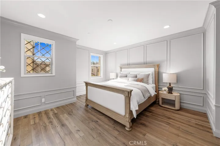 The main level showcases natural stone flooring in an elegant herringbone pattern, complemented by custom French wall moldings and architectural detailing that create a timeless, Parisian-inspired ambiance. The chef’s kitchen features premium cabinetry and flows seamlessly into the great room, centered around a custom contemporary electronic fireplace.