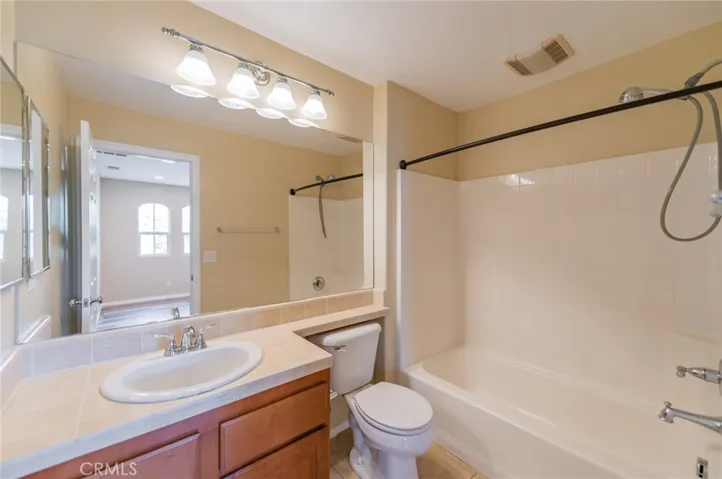 Upstairs, a spacious second level features three bedrooms and a versatile loft area ideal for a home office, study space, or additional lounge. The two secondary bedrooms are generously sized and equipped with ceiling fan lights. The primary suite includes a built-in dresser, dual vanities, shower in tub, and a well-organized walk-in closet with ample storage.