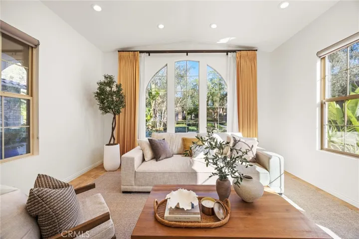 The light-filled interior is designed for comfort and entertaining. The open-concept layout showcases soaring ceilings, custom window coverings, and an airy, welcoming feel. The upgraded kitchen features an expanded center island, additional custom cabinetry, and elegant double French doors that open seamlessly to one of two private courtyards for effortless indoor-outdoor living.