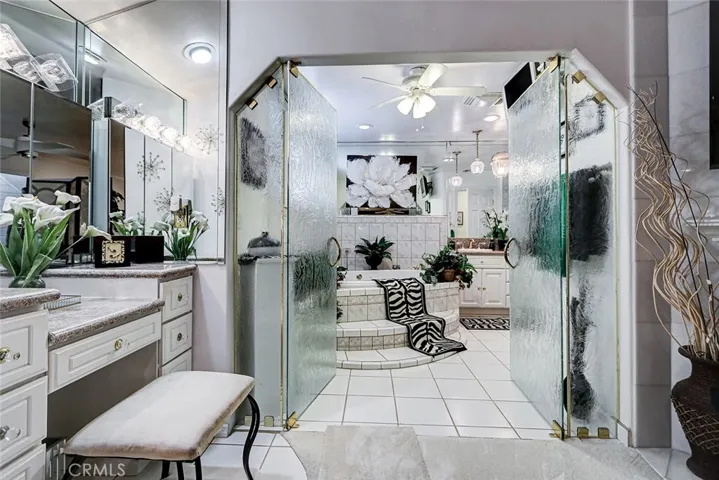 The primary suite is a true retreat, complete with its own fireplace, wall-mounted TV, and a spa-like en suite bathroom with a jetted soaking tub, marble-style tile, crystal pendant lighting, glass-enclosed shower, and dual vanity. An additional bedroom currently serves as an office/media room with mirrored accent wall.