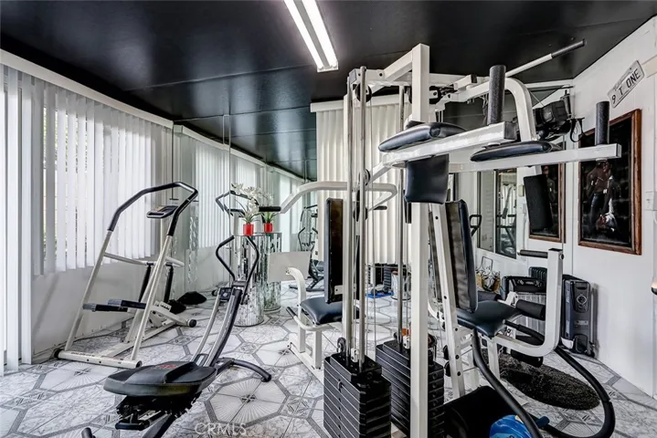Beyond the main living areas, the home features a game room with space for a full-size pool table and built-in bar seating, plus an adjacent home gym equipped with mirrored walls for a complete workout setup. A dedicated hot tub room with plantation shutters offers a private place to unwind any time of year.