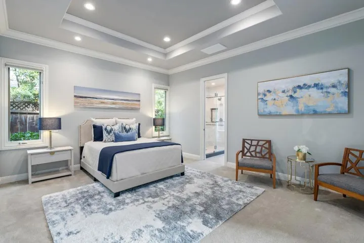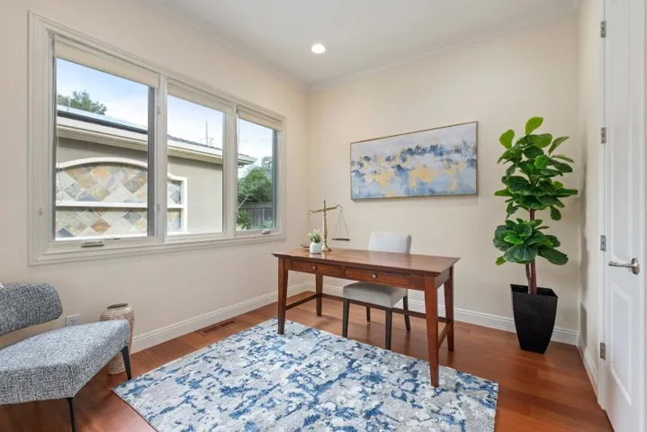 Welcome to 1045 Atkinson Lane, located approximately 1 mile from downtown Menlo Park. The main home offers 4 bedrooms and 3 full baths with 2,720sf of living space, plus a separate studio ADU with kitchen and full bath and additional 576sf for a total combined 3,296sf. Stately double doors open to an inviting foyer. This premier residence boasts a beautiful chefs kitchen, adorned with quartz counters, an expansive island, and lots of cabinet space. Stainless steel appliances include a double Viking oven, six-burner Viking gas range, Thermador fridge, and Cove dishwasher. The home is bathed in natural light through expansive windows and soaring ceilings. Hardwood flooring throughout the main living areas. En-suite bedroom is located on the South wing of the home off the kitchen, while the North wing hosts 3 additional beds and 2 baths, including the luxurious primary. The spa-inspired primary bath showcases an oversized Victoria + Albert soaking tub, elegant dual vanity with tasteful stone counters, and a dramatic double shower. Large walk-in closet with built-in custom Valet cabinets. In the backyard you will find a spacious patio and separate lawn area great for gatherings along with space for gardening. 2 car garage and photovoltaic solar. Top rated schools.