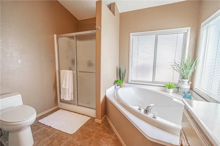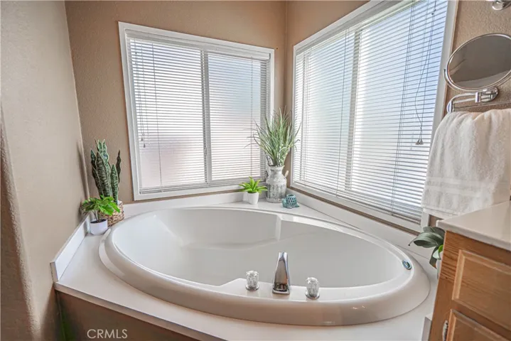 The spacious primary suite includes a walk-in closet and a private ensuite bathroom with a step-in shower, double vanity, soaking tub, and a sliding glass door leading directly to the backyard. Additional highlights include a dedicated laundry room with generous storage cabinetry.