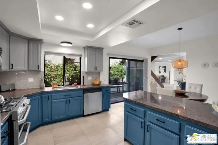 Experience resort-style living in the South Palm Springs community of Waverly Park, ideally situated on fee simple land. Step inside to find elegant porcelain tile flooring spanning the entire first floor, complemented by a stunning wooden staircase leading to the upper level. The inviting living area showcases a stacked stone gas fireplace, creating a warm focal point for relaxing evenings. Enjoy seamless indoor-outdoor living with a large, private enclosed courtyard off the living areas. The kitchen is both stylish and functional, featuring two-tone cabinetry, granite countertops, a ceramic tile backsplash, stainless steel appliances and a single-basin stainless steel sink. The spacious downstairs bedroom features an en-suite bathroom that has been completely remodeled with custom cabinetry, quartz countertops, shiplap accent backsplash, and frameless shower door with custom ceramic tile enclosure. Upstairs, the expansive primary bedroom features luxury vinyl flooring for a warm and modern touch. The primary bath has also been tastefully updated and features quartz countertops, a frameless shower door, a large soaking tub, and elegant ceramic tile finishes. The rooftop patio off the primary suite offers an additional private outdoor retreat featuring stunning San Jacinto Mountain views. Additional highlights include direct access to a two-car garage with insulated garage door panels, gas or electric dryer hookups, and newer window treatments throughout. Residents enjoy outstanding community amenities including two tennis courts, two pickleball courts, three pools, and three hot tubs. HOA dues cover water and trash, exterior stucco and roof maintenance, as well as upkeep of the common areas.