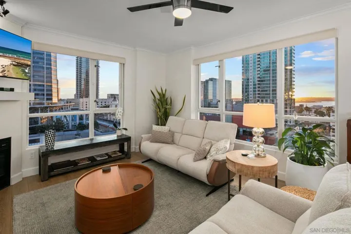 Prime southwest corner residence at Treo in the prestigious vibrant Columbia District/Little Italy, showcasing sweeping panoramic views of the downtown skyline and sparkling bay and waterfront. Offering approximately 1,441 square feet, this beautifully remodeled 2-bedroom, 2-bath plus 3rd room den/office floor plan is elevated by its desirable corner positioning and two private balconies that capture water and city views plus natural light throughout. Designed as a true turnkey opportunity, every detail has already been thoughtfully curated. Luxury vinyl plank flooring flows seamlessly throughout the home, complemented by a stunning remodeled kitchen with sleek quartz countertops, tile backsplash, designer cabinetry and stainless steel appliances. The upgraded bathrooms feature modern finishes and clean, contemporary design. Fresh interior paint enhances the light and airy aesthetic. Two secured parking spaces and dedicated storage add exceptional convenience. Ideally positioned in one of Downtown San Diego’s most walkable neighborhoods, residents enjoy effortless access to the Waterfront Park, Little Italy’s renowned dining scene, the Embarcadero, Seaport Village, Santa Fe Depot, and premier shopping and entertainment. Treo offers resort-style amenities including a lap pool and spa, state-of-the-art fitness center, resident lounge, outdoor BBQ area, on-site management, and secured entry. With its prime location, impeccable condition, and exceptional lifestyle appeal, this residence truly embodies the best of urban luxury living.