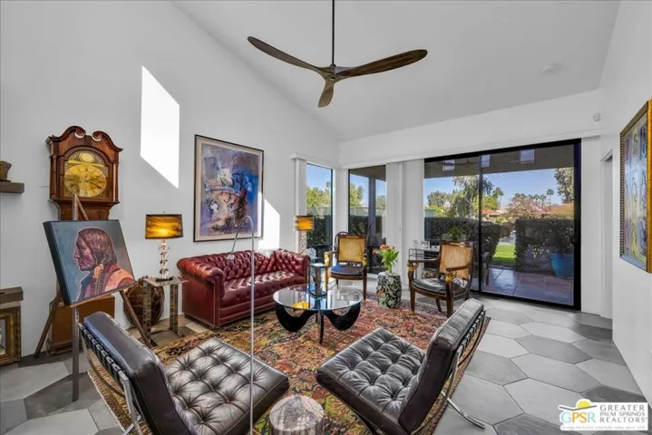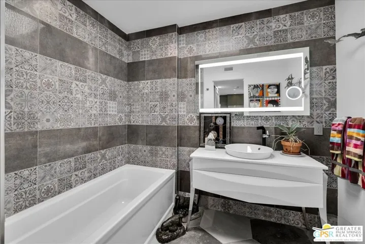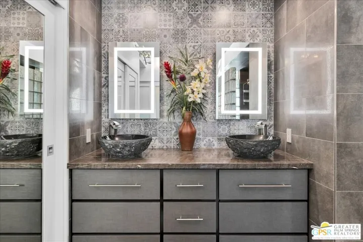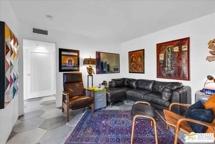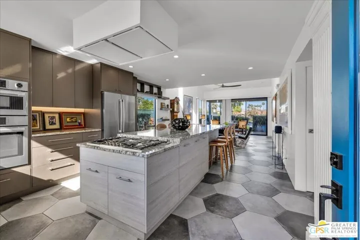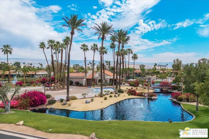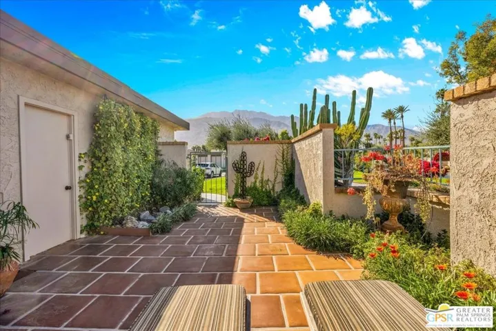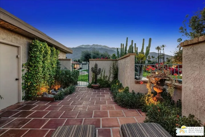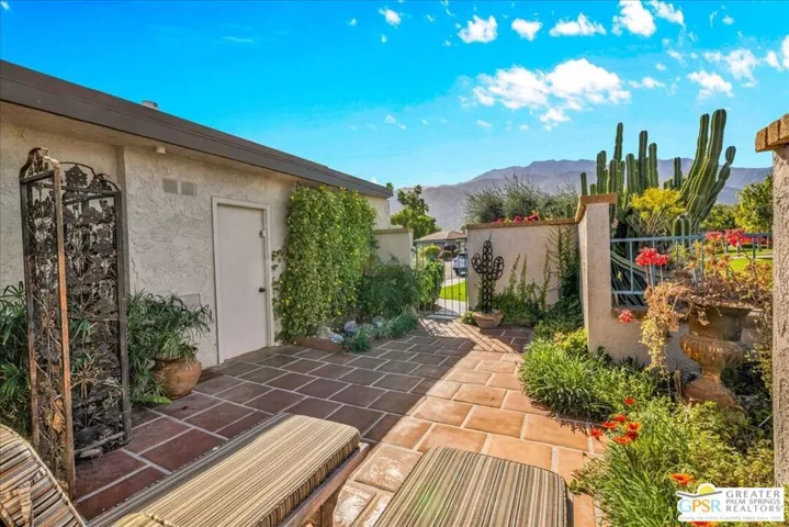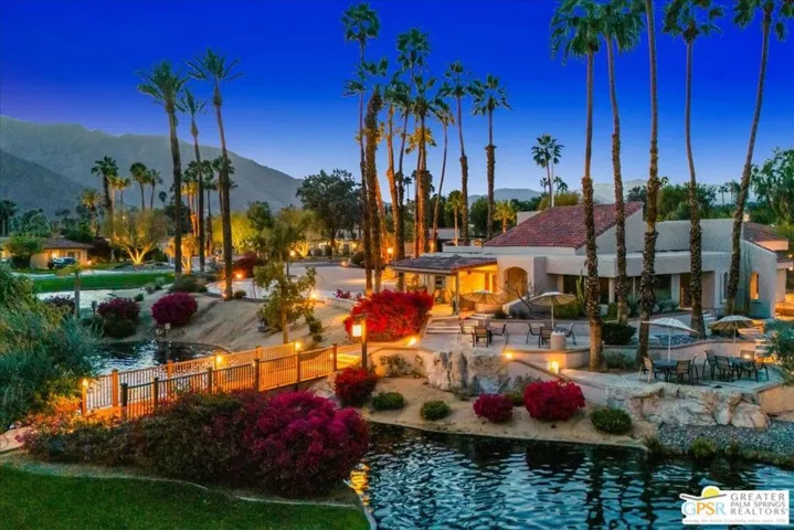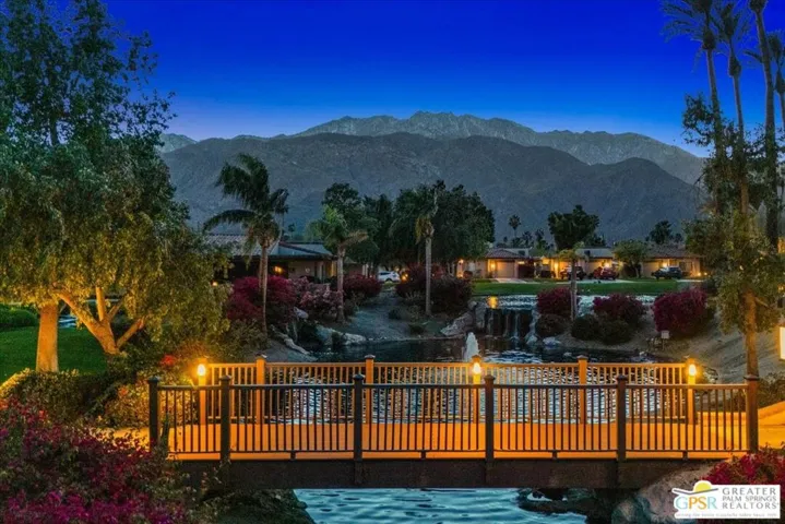 Experience the pinnacle of Palm Springs living in this meticulously reimagined 1,252-square-foot residence. Every inch of this single-level, two-bedroom, two-bath home has been transformed with luxury materials and thoughtful attention to detail. The open-concept layout is centered around a show-stopping Chef’s kitchen, anchored by a 12-foot granite waterfall island with ample integrated storage, top-of-the-line Bosch stainless steel appliances, and a professional Zephyr range hood. Custom cabinetry with dovetail and soft-close finishes provides a sophisticated, tailored feel. From sunset cocktails to gourmet dinner parties, this Chef’s kitchen blends high-design aesthetics with pro-grade performance for a truly elevated entertaining experience. The interior is bathed in light by added clerestory windows and premium Milgard energy efficient windows and doors. Porcelain tile floors flow seamlessly into the bathrooms, which feature custom tile work and lighted vanity mirrors. Additional upgrades include Bali Blinds, custom California Closets, Pelican water filtration system, a 16 Seer Rheem HVAC unit and recessed lighting. Enjoy true indoor-outdoor living from the front and back patios with hand-laid Saltillo tiles and breathtaking panoramic mountain views. Positioned on an incredible interior lot on a quiet cul-de-sac by the pond, bridge and walkways, you are just steps from one of the desert’s most beautifully landscaped gated enclaves. Set within 43 acres of mature, park-like grounds, this premier gated community offers the ultimate desert playground with six sparkling pools, pickleball, and tennis courts. It is a serene sanctuary that feels worlds away, yet sits just minutes from the iconic energy of downtown Palm Springs. Impeccably reimagined and perfectly positioned, this isn’t just a home; it’s your new desert masterpiece.