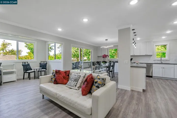 Your NEW DREAM HOME awaits! Step into this beautiful remodeled Sonoma Wrap end-unit, and you’ll immediately appreciate the custom updating with open, modern flair, and the feeling of luxury. Featuring 2BD/2BA at +/-1,150sqft. Come see the sparkling kitchen with extensive Shaker cabinetry. Gorgeous lunar quartz countertops, new SS appliances, and bonus wine refrigerator. The kitchen flows seamlessly into the dining area and wraparound deck, offering picturesque nature views, and plenty of space to entertain. The primary bath offers a wide dual-sink vanity and an artfully tiled walk-in shower. The secondary bath offers a convenient tub/shower combo – picture serene relaxation with bubbly, or even bath time with the little ones! Every room has expansive windows to provide natural light, crown molding, recessed lighting, and coordinated fixtures. Other features include an in-unit W/D combo, a sleek electric fireplace for décor or warmth, custom bookshelves, a Nest thermostat, and more! Nestled within Rossmoor’s active 55+ country-club style community, enjoy amenities of golf courses, tennis/pickleball courts, bocce, 3 swimming pools, fitness center, restaurant, event hall, clubhouse and a library! Minutes to downtown Walnut Creek, filled with great restaurants, shopping and parks.