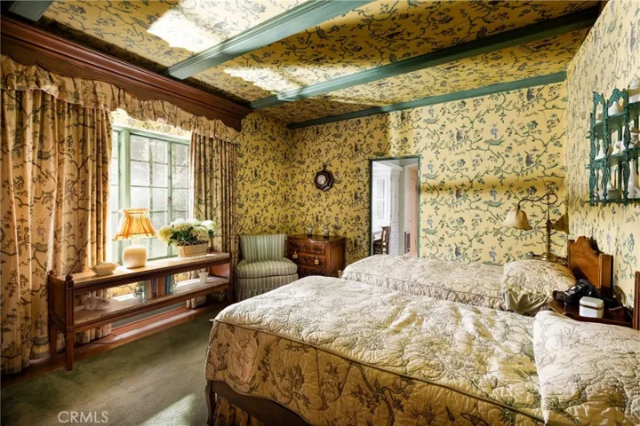 Tucked away amidst a forest of towering pine, cedar, and oak trees, “Happy Landing” is a sanctuary of serenity and seclusion. The main house, designed with graceful architecture, showcases exquisite craftsmanship with original woodwork, detailed paneling, and charming built-ins. Enter through the enchanting turreted foyer into a formal living room boasting high-beamed ceilings and an antique wood-burning fireplace. The main house features two spacious family bedroom suites and a whimsical children’s bunk room.