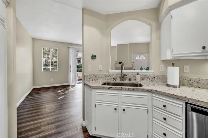 Desirable ground-floor end unit featuring 2 bedrooms and 2 bathrooms, located in the beautiful gated community of Viewpointe North. This popular floor plan offers an open living space and a large private patio extending from the living room to the primary bedroom. The inviting living room features laminate flooring, a cozy fireplace, and a large sliding glass door providing abundant natural light and direct patio access. The adjacent dining area includes an updated chandelier, creating an ideal space for entertaining. The remodeled kitchen showcases quartz countertops, white cabinetry, recessed lighting, stainless steel sink and faucet, and stainless steel appliances, including a refrigerator. Down the hall are two bedrooms, a guest bathroom, and a convenient indoor laundry closet. The spacious primary bedroom offers laminate flooring and a large sliding glass door leading to the private patio. The updated primary bathroom features a walk-in shower, dual-sink vanity, recessed lighting, and a walk-in closet. The guest bedroom includes laminate flooring, mirrored closet doors, and a peaceful greenbelt view. The guest bathroom offers a bathtub/shower combination. Additional highlights include a one-car attached garage with direct access and one designated covered carport nearby. Viewpointe North amenities include two pools, five spas, a clubhouse, and dual gated entries.