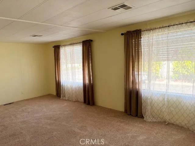 Nice living and dining rooms has a built-in hutch with carpet and pergo-type flooring.