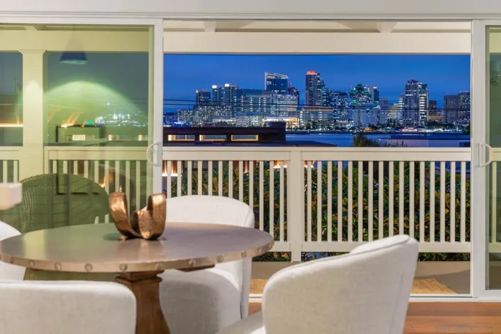 Amazing opportunity to own a distinguished residence on the highly desirable 1st st in Coronado. This home features a versatile floor plan, perfect for multi-generational living and entertaining. Upon entering the first floor, you’ll find a spacious Guest quarters complete with a living/dining area, kitchenette, a generously sized bedroom with walk-in closet, full bath, and a serene private patio—ideal for visitors or extended family stays. The main living quarters is upstairs, where the expansive living, gourmet kitchen and dining room opens to a breathtaking 50-foot balcony that runs the full length of the home, offering unobstructed panoramic views of the bay and city skyline. The master suite is a tranquil retreat with its own bath, complemented by a well-appointed guest bedroom and bath. Additional features include back stairs and a second-floor balcony, enhancing the home’s accessibility and charm. This residence not only offers a remarkable living space but also a lifestyle enriched by its scenic surroundings and unique architectural design. Make this stunning property your home and enjoy the quintessential Coronado experience.