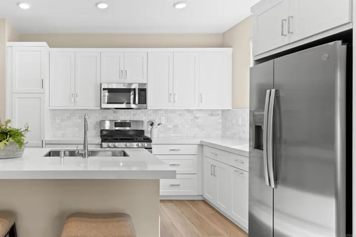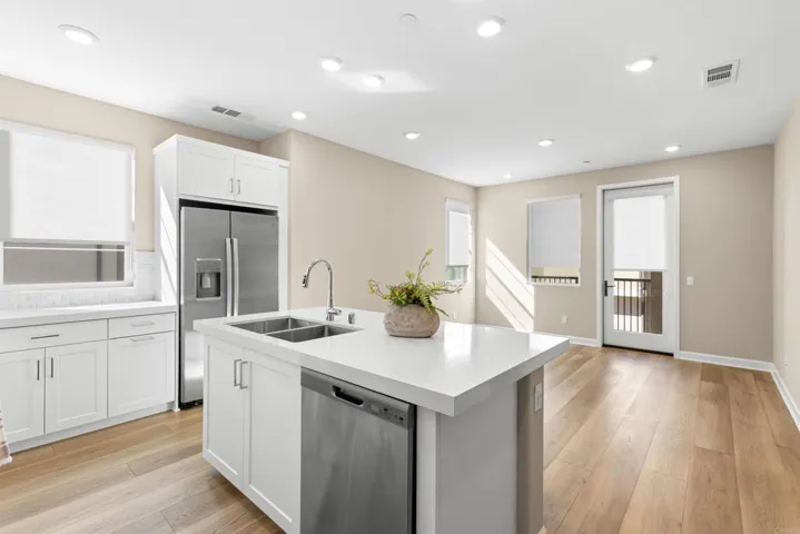 Welcome to this beautifully upgraded, move in ready residence in San Marcos. Better than New Construction, this home offers modern finishes, thoughtful upgrades, and turnkey convenience. The bright open concept kitchen features crisp white shaker cabinetry, quartz counter tops, stainless steel appliances, upgraded backsplash with subway tile and a spacious island. The natural light highlights the larger wide luxury plank flooring and contemporary recessed lighting throughout. This desirable end unit offers a great layout features a bedroom and full bathroom on the main living area ideal for roommates, guests, or multi generational living, or private office. The thoughtful floor plan provides separation and privacy between living spaces, making it functional and flexible for today’s lifestyle. Paid solar! electric vehicle compatible, Low electric 2 car garage, gated community with quick access to highway 78, and 15. This tucked away end unit townhome has only one neighbor to the left away from main street noise with direct access to home from garage. Dont miss opportunity