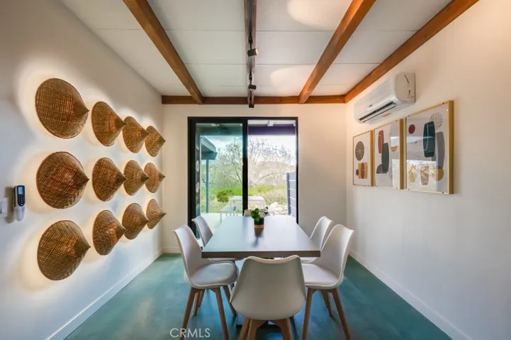 This home is a 1961 homestead with a low modern roof line and beamed ceilings, the floor is polished concrete is stained aqua marine in juxtaposition of its pink exterior like an image from Hubble. The Kitchen is socially open to both the living room and dining room separately to left and right. It features under counter appliances and open shelving to preserve head space. The stove and fridge are retro Classic brand in power coated aqua further nodding to the home’s mid-century vibe. Island and counters are black marble quartz with waterfall ends, providing extra storage and under counter drawer microwave and dishwasher.
