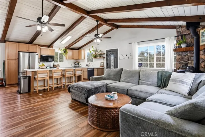 The main home features 3 bedrooms, 2 bathrooms, and an extensively remodeled interior with new flooring, fixtures, electrical outlets, switches, and dual-pane windows throughout. The show-stopping kitchen boasts quartz countertops, and premium soft-close plywood cabinetry. A wood-burning stove imported from Ireland adds warmth and character, while a new mini-split system with smart controls ensures year-round comfort.