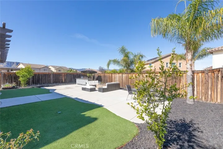 The backyard is truly an entertainer’s dream, complete with artificial turf in both the front and back for low maintenance living, a custom Alumawood patio cover, a built-in barbecue island, and a cozy fire pit perfect for gatherings year-round.
