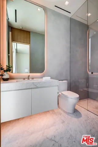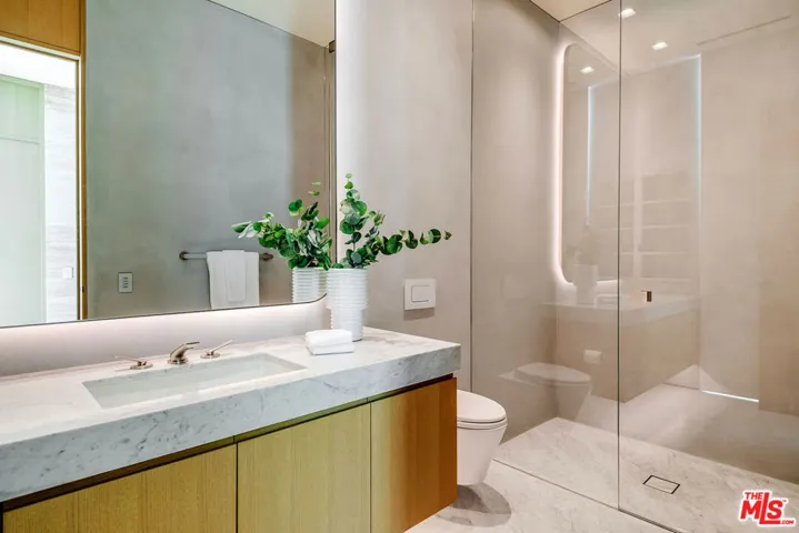 Experience a heightened level of contemporary luxury in this newly constructed estate nestled within the coveted Bird Streets. Crafted with exceptional materials and finishes, this residence defines elevated Los Angeles living, offering sweeping jetliner views from Downtown to the Pacific Ocean. Designed by Paul McClean, built by Dugally Oberfeld, and appointed with interiors by Marmol Radziner, the home presents an unparalleled level of design and amenity. Encompassing approximately 15,200 square feet with five bedrooms and nine baths, the estate provides generous accommodations for entertaining, guests, and staff. A gated drive ensures privacy and security, leading to a subterranean six-car garage. Arrival begins at a serene, walled desert-inspired courtyard, where a bridge extends above the lower-level pool, setting a dramatic tone. Outfitted with advanced smart home technology and expansive automated glass walls, the interiors seamlessly capture the surrounding vistas. The main level features a sophisticated living room with fireplace, formal dining room, two powder rooms, an entertainer’s kitchen with eat-in island and breakfast area, and a secondary prep kitchen equipped with Wolf and Sub-Zero appliances. Two guest suites accompany a stunning primary suite complete with panoramic views, custom walk-in closet, and a luxurious marble bath with sauna. Indoor spaces transition effortlessly to an expansive terrace with a sunken fire feature, built-in seating, and a striking zero-edge pool and spa. The lower level, accessed by a floating staircase or elevator, reveals a true entertainment and wellness retreat, including a second pool, fire feature, expansive family room with bar and fireplace, glass wine display, game room, covered patio with spa, theater, gym, and dedicated wellness suite with massage room, shower, and sauna. Additional amenities include two guest suites, a powder room, and laundry. This exceptional hillside sanctuary is moments from Sunset Boulevard and the finest dining, shopping, and nightlife Los Angeles has to offer.