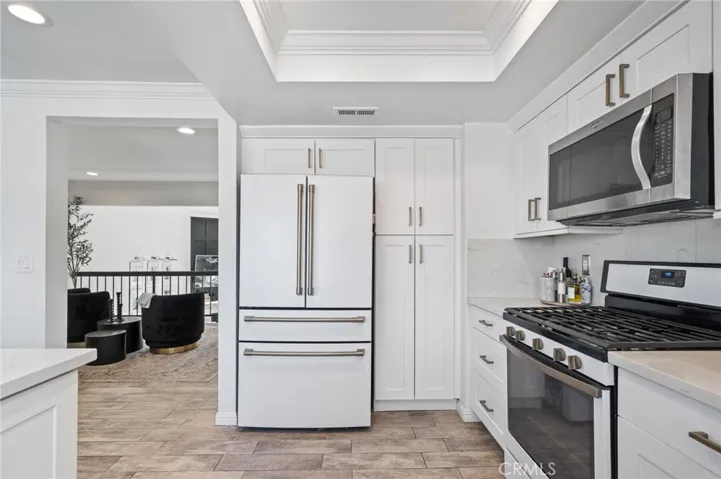 The remodeled kitchen is both timeless and on-trend, featuring shaker-style cabinetry, quartz countertops, brass hardware, and stainless steel appliances. It opens seamlessly to a chic dining area accented by plantation shutters, perfect for both intimate dinners and entertaining.