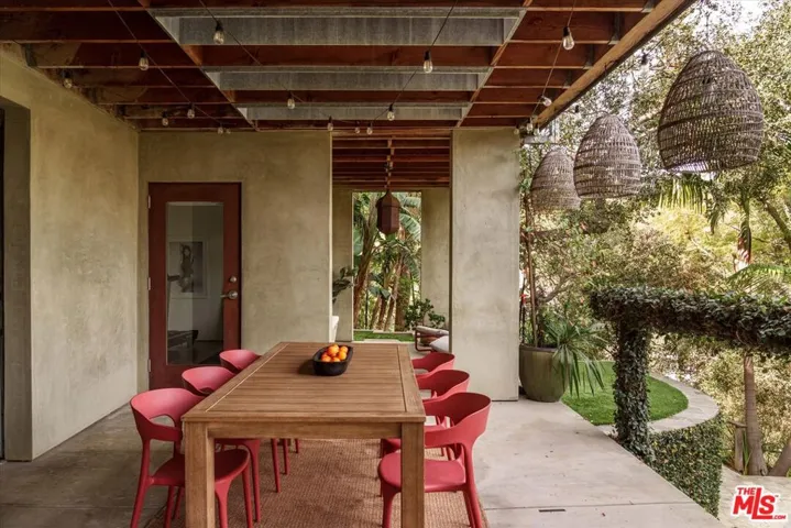 A striking architectural retreat perched at the top of Laurel Canyon, 8882 Lookout Mountain sits across four contiguous lots surrounded by mature trees, offering exceptional privacy and sweeping canyon-to-mountain views. Upon entering you are greeted with a dramatic living room where indoors and outdoors merge seamlessly, anchored by a mature tree growing through the space, and framed by skylights that filter soft light through its canopy. Floor-to-ceiling steel windows capture expansive views throughout. The chef’s kitchen features stainless counters and island, custom cabinetry, and premium appliances, flowing effortlessly into the formal dining room with fireplace. Two additional bedrooms complete this level, one currently styled as a den. The primary suite occupies its own level, creating a true private retreat with a fireplace, walk-in closet, spa bath, and a retractable soaring ceiling. The lower level offers a bedroom, bath, kitchenette, sitting area, and gym ideal for guests, creative studio use, or extended living. The outdoor spaces are equally transporting, with layered decks and patios, an outdoor lounge complete with a pizza oven, and a pool with built-in spa, a sauna, and cold plunge, all set against breathtaking canyon views. With a separate garage, four total parking spaces, abundant natural light, and bold architectural presence, this is a rare hillside compound where design, privacy, and nature converge.