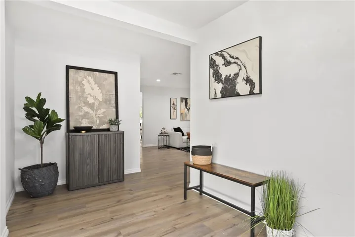 Expansive living spaces open through new sliding doors to a stunning backyard retreat. Designed for elevated outdoor living, the exterior showcases smooth new stucco, fresh sod, desert-inspired landscaping, a large covered patio, custom fire pit, and a newly retiled pool—ideal for hosting or relaxing in complete privacy. The front yard is enhanced with California native plantings and a drought-conscious irrigation system.