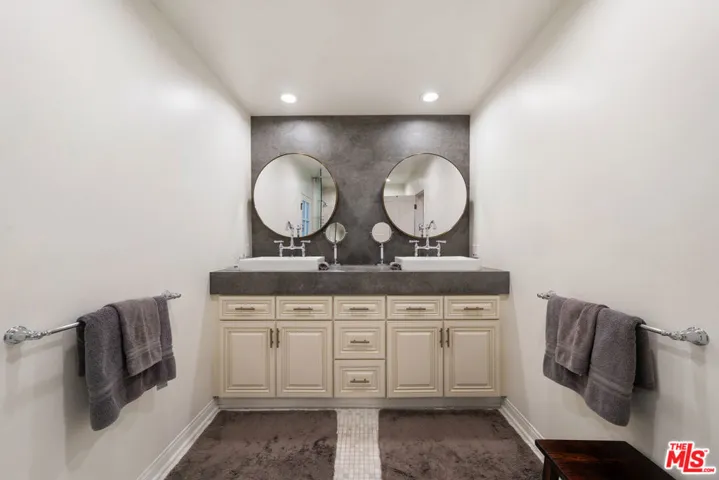 Located in the heart of Longridge Estates, this single-story completely updated traditional residence embodies timeless sophistication, complete privacy, and effortless livability. Behind secure gates, the home reveals a serene retreat surrounded by lush, mature landscaping, an entertainer’s paradise and a private sanctuary all in one. Step inside to discover wood-beamed ceilings, herringbone-patterned floors, designer lighting, French doors, and elegant fireplace mantels that showcase the home’s refined craftsmanship. The thoughtfully designed layout, a true traditional floor plan rarely found today, allows each room to maintain its own character while flowing seamlessly together, perfect for both intimate gatherings and large-scale entertaining. A formal living room anchored by a stately fireplace welcomes guests just off the entry, while the spacious family room with built-in wet bar, additional seating, and direct patio access sets the stage for effortless entertaining. The formal dining room, with seating for eight-twelve beneath a statement chandelier and bay windows, connects beautifully to a well-appointed kitchen featuring stainless steel appliances, shaker-style cabinetry, and generous storage. The primary suite offers a tranquil retreat bathed in natural light, complete with a walk-in closet and a spa-inspired bathroom boasting dual vanities and a large frameless glass shower with custom tilework. Two additional guest bedrooms and a full bath provide comfort and flexibility, while two half baths add convenience throughout. Outdoors, the property transforms into a resort-like escape with a sparkling pool and spa surrounded by manicured greenery, multiple lounging and dining areas beneath a pergola, and an expansive patio ideal for hosting under the stars. The fully gated grounds provide the ultimate sense of seclusion, while the front courtyard offers additional seating areas for quiet reflection or casual conversation.