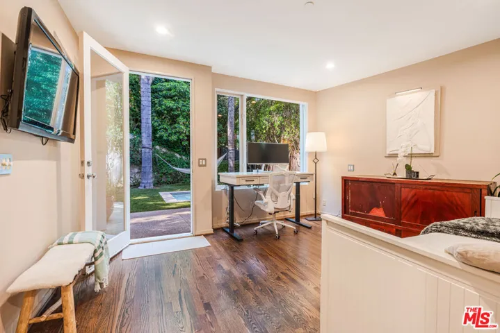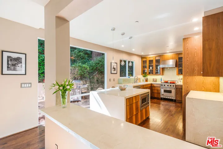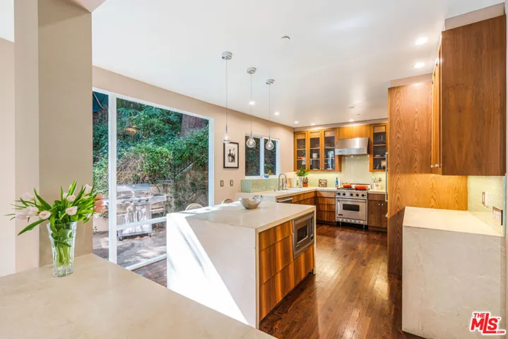 Discover this private and gated retreat nestled amidst the verdant landscapes of Laurel Canyon, located within the award winning Blue Ribbon Wonderland school district on a quiet non through street . This quality built architectural residence combines contemporary sophistication with peaceful serenity and offers the ideal haven from the urban life yet is just minutes from the dining , shopping and nightlife of West Hollywood , Beverly Hills and Sunset Plaza . Natural light abounds from the high ceilings and gorgeous window lines and its open spaces flow seamlessly from the inviting indoors to the spacious outdoors. The main level boasts an open- concept living room, dining room and kitchen, designed to feel both expansive and intimate. Soaring cathedral ceilings create a sense of grandeur, while oversized windows frame views of mature trees , filling the space with natural light and a magical , tree – house – like ambience. The gourmet chefs kitchen is a culinary enthusiasts delight. Outfitted with premium appliances, sleek counter tops, abundant storage and a large center island, it is ideal for hosting gatherings or enjoying intimate family dinners. If the outdoors is where you prefer to gather, then the outdoor BBQ and dining area is ready for your entertaining . After dinner, step into your lush private yard and dip into the large spa that doubles as a plunge pool, or siimply lounge in your lazy hammock that is engrossed by lush greenery. This home offers 3 generous bedrooms and 3 bathrooms, plus office , studio , or gym. Two of the bedrooms are accompanied by spa-inspired en-suite baths and walk in closets. The primary suite spans the entire top floor and is enhanced by an adjoining space ideal for mediation, yoga, exercise, studio or home office. Steps from the primary, you have your very own rooftop deck, perfect for morning coffee or evening wine and star gazing The tranquil, gated property is situated in prime Laurel Canyon offering the dual benefit of seclusion and easy access to Los Angeles’s vibrant culture.