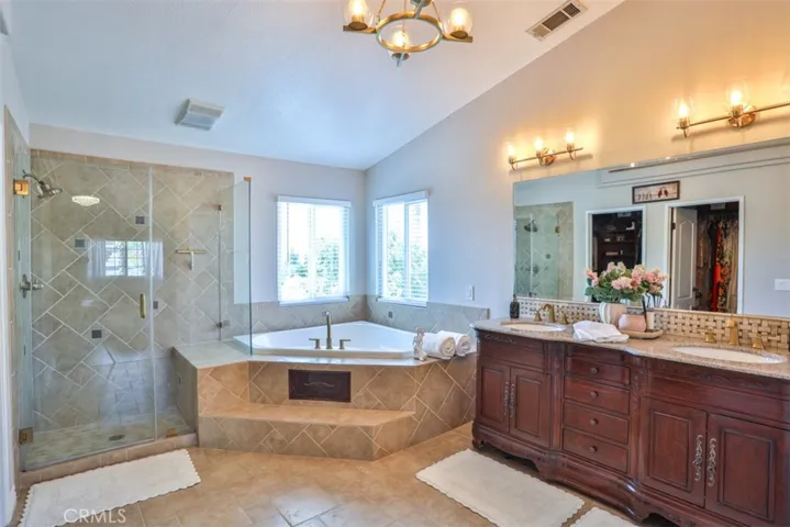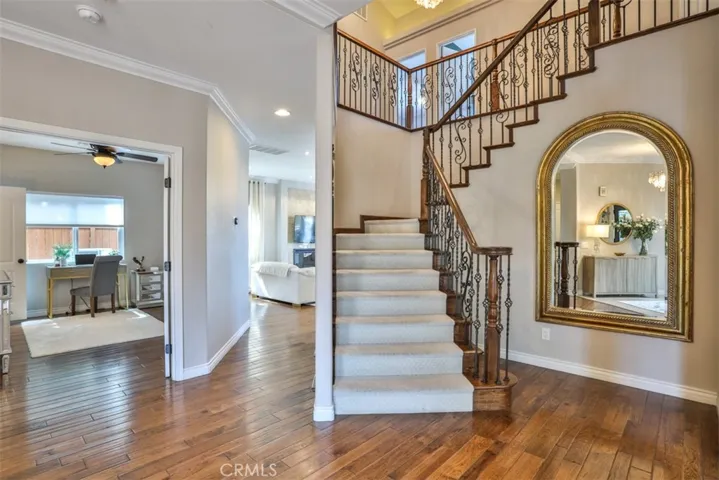Elegant, Sophisticated and Spacious Temecula Residence in Quiet Neighborhood. Inviting Curb Appeal and Charming Water Fountain Lead to Beautiful Double Door Entry. Impressive Foyer, Living Room and Formal Dining Room are Flooded with Natural Light and Gorgeous Lighting Fixtures and Chandeliers Throughout the Home Add Sparkles and Glam. Stylish Kitchen Includes Center Island, Coffee Bar, Walk-In Pantry and Opens to Cozy Family Room with Fireplace and Two Sets of French Doors Leading to Wonderful Backyard. Main Level Also Includes Bedroom/Office, Bathroom and Laundry Room with Direct and Convenient Access to Backyard for Your Pool Guests. Elegant Staircase Leads Upstairs to Luxurious Primary Suite with Vaulted Ceilings, Oversized Soaking Tub, Separate Shower, Two Walk-In Closets with Organizers and Double Vanity. Two Additional Bedrooms Have Direct Access to Large Balcony to Enjoy Forever Views and Spectacular Sunsets. Unwind and Relax in Your Private Theater and Enjoy Endless Movie Nights on a Large Screen TV. Home Theater Can Be Easily Turned Into Second Master Bedroom, and it Includes Spacious Bathroom. Dedicated Home Office/Work/Study Space with Four Desks Is Also Located Upstairs. Enjoy Entertaining in Style; Sparkling Salt Water Pool, Spa and Oversized Patio. BBQ Island is Included. Step Down to the Orchard with Numerous Fruit Trees; Lemon, Lime, Orange, Apple, Asian Pear, Plum and Peach. Relax on Your Bottom Patio, or Treat Yourself to Yoga or Workout Session. Opportunity to Plant More Trees or Grow Your Garden on the Remaining Part of Your 1/3 Acre Lot. Close Proximity to Town, Excellent Schools, Shopping, Dining, Golf and Temecula Wine Country. No HOA, Low Property Tax Rate, Paid Solar System. This Truly Stunning Property is Perfect Blend of Luxury and Comfort. 3.25% Assumable Loan for Qualified VA Buyers. Welcome Home!