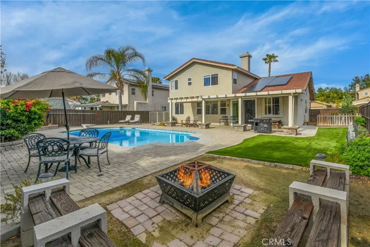 Stunning pool home located in one of West Murrieta’s most coveted neighborhoods, within walking distance to award winning schools. Tucked away on a peaceful cul-de-sac, this beautifully designed home offers the perfect blend of comfort, function and fun. You’ll pass a charming front porch and enter into a formal living room with a dining area. The kitchen is perfect for the chef in the family, and features recessed lighting, granite tops and a center island. The kitchen is open to the comfortable family room which features a cozy fireplace and stunning views of the back yard. A highly desirable downstairs bedroom and bath provide ideal flexibility for guests, multi-generational living, or a private home office. Upstairs you’ll find 3 more roomy bedrooms including the romantic primary bedroom with private bath. The other 2 bedrooms share a hall bath. Step outside into a true entertainer’s backyard and your own personal retreat that features a covered patio, sparkling pool, and inviting firepit, perfect for hosting gatherings, summer barbecues, and relaxing evenings under the stars. The spacious outdoor layout creates seamless indoor-outdoor living and a lifestyle that feels like a permanent vacation. This home is located in a quiet, established neighborhood that is close to shopping, dining, Temecula wineries, and hiking at Santa Rosa Plateau. Also commuter close to the 15 and 215 freeways. This home offers tranquility and convenience, plan your visit today!