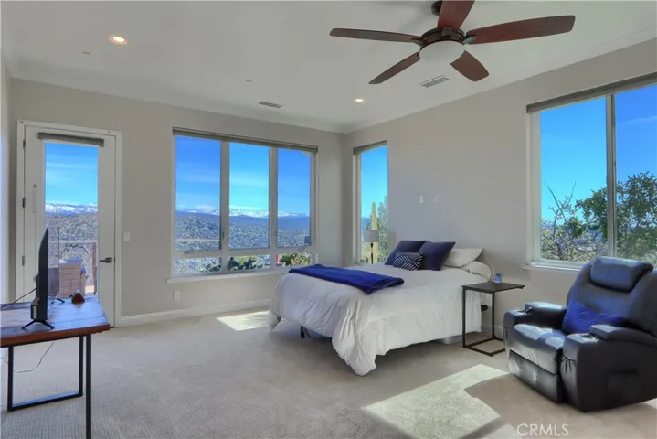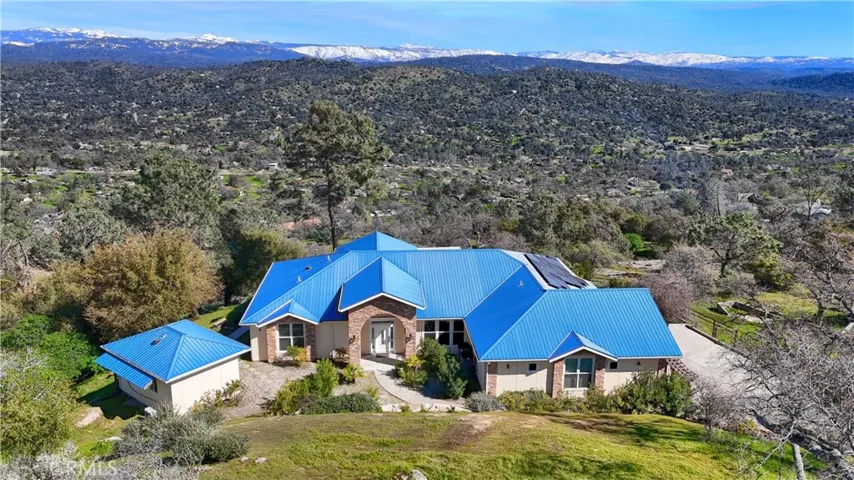 A gently winding private driveway approximately one-tenth of a mile from the main road leads to the home, enhancing privacy and creating a quiet, secluded setting. Notable features include metal roof, fire-resistant siding, fire sprinklers, fire-rated windows, and owned solar. Additional amenities include a private gated entry, three-car garage with separate workshop waterfall fountain at the entry, and low-maintenance natural landscaping with drip irrigation. Property is ideally situated above the fog and below the snow, offering privacy, scenic beauty, and comfortable year-round living.