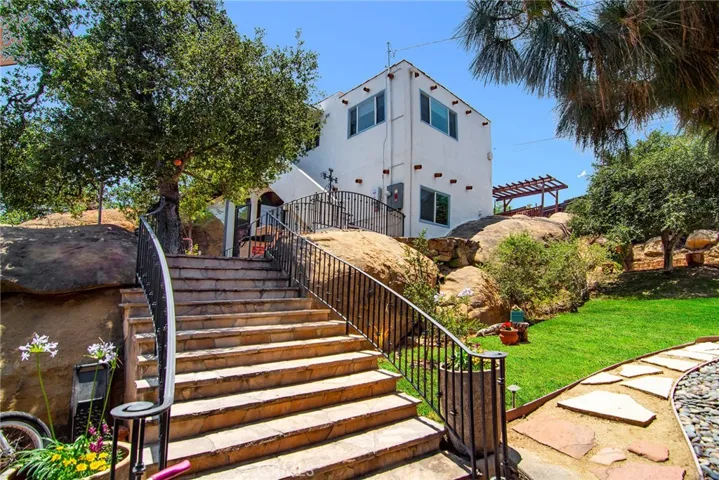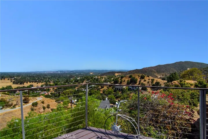 This Spanish adobe residence is situated on a sandstone ridge in West Hills, offering unobstructed 360-degree views of the San Fernando Valley and surrounding canyon terrain. The home includes 3 bedrooms and 3 full bathrooms across an open-concept layout featuring vaulted ceilings with exposed wood beams.