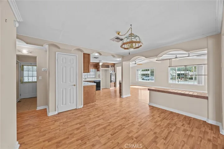 The home offers an open floor plan with abundant natural light and wheelchair accessibility for ease of living. The kitchen features glass-front cabinetry and deep storage drawers, including built-in spice and flour storage for added functionality and organization. Both bedrooms are well-sized, and the primary suite includes a private bathroom.
