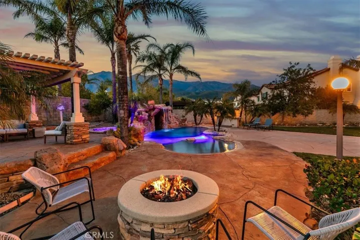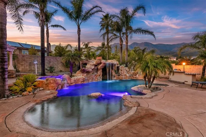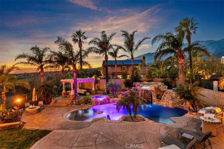 Welcome to an extraordinary executive estate in the prestigious Sheridan Estates of Rancho Cucamonga, where luxury living meets breathtaking city lights and mountain views. Situated on an expansive near half-acre lot, this former model home showcases impeccable design, upgraded features, and refined elegance throughout. From the moment you enter, you are greeted by soaring ceilings, natural light, and thoughtfully curated finishes that reflect true pride of ownership. The remodeled chef’s kitchen is the heart of the home, featuring premium brand-new stainless-steel appliances, custom cabinetry, upgraded quartz countertops, and seamless flow into spacious living and entertaining areas. Designed for flexibility and comfort, the home offers a desirable downstairs bedroom and full bathroom—perfect for guests, multi-generational living, or a private office. The primary suite offers dual closets, plantation shutters, and your own private balcony with gorgeous city light views. The massive bathroom offers a jetted tub, dual sinks, a walk-in shower, and recently painted. Step outside into your own private resort. The backyard is a true paradise, complete with a dramatic rock pool and spa with grotto, built-in barbecue, fire pit, large rock fireplace, and expansive entertaining spaces—all framed by panoramic city light and mountain views. Whether hosting sunset gatherings or enjoying quiet evenings under the stars, this outdoor sanctuary delivers unmatched ambiance and privacy. Additional highlights include RV parking, a three-car garage, upgraded finishes throughout, and immaculate maintenance that makes this home completely move-in ready. This is more than a home—it’s a lifestyle of elegance, comfort, and elevated California living in one of Rancho Cucamonga’s most desirable communities.
