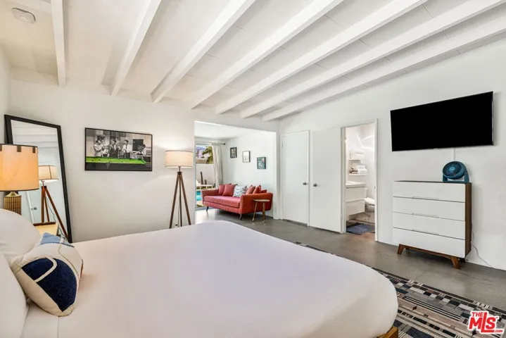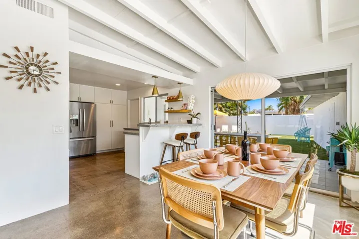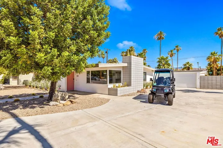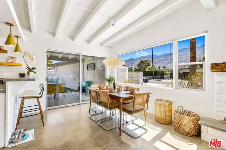 Located in the highly sought-after Sunrise Park neighborhood of Palm Springs, this authentic Mid-Century Modern home sits on an oversized corner lot with a dramatic circular driveway, offering rare curb appeal, privacy, and abundant parking. Iconic architectural details define the interior, including soaring wood-beamed ceilings, polished concrete floors, and expansive walls of glass that flood the home with natural light. The open-concept layout flows seamlessly to the backyard, where west-facing San Jacinto Mountain views create stunning sunset backdrops. A statement fireplace with a reclaimed wood mantle adds warmth and character. In addition to three bedrooms, a spacious bonus room currently functions as a fourth bedroom, providing flexible space for guests, a home office, or media room. The fully gated backyard delivers true Palm Springs living with a saltwater pool and spa, covered patio, and low-maintenance turf landscaping. Just minutes from downtown dining, shopping, and golf, this property blends timeless Mid-Century style, lot presence, and versatility in one exceptional offering.