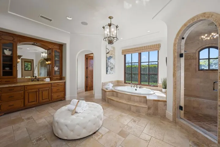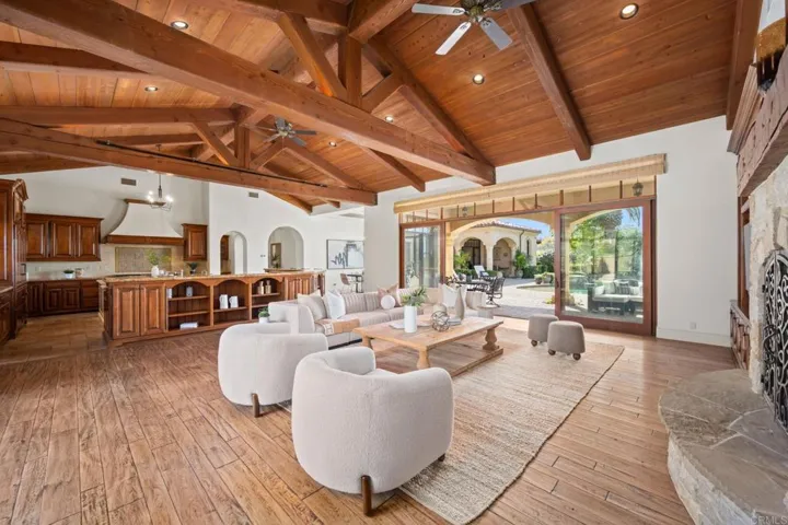 This stunning Greg Agee–built custom estate sits on an elevated lot in the guard-gated community of Rancho Pacifica, offering beautiful views, an A+ floor plan, and seamless indoor/outdoor living. The main level features a luxurious primary suite with spa-like bath, en-suite guest room, wood paneled office, climate-controlled wine cellar, home theater, gym/game room, and living/dining rooms with views of the resort-style backyard. The chef’s kitchen and great room open to a covered patio with fireplace, outdoor kitchen, and a gorgeous pool and spa, surrounded by lush landscaping, fruit trees, and a grassy area perfect for kids or pets. Interior highlights include French Traditions custom cabinetry throughout, pecan plank wood and travertine floors, and brand new laser jet theater projector, plus in-home speakers, fully paid solar, and Lutron lighting system. Residents love Rancho Pacifica’s highly sought-after West-side location, offering easy access to shopping or dining at One Paseo, top-rated schools, the beach, and major freeways—all while feeling exceptionally private and tucked away. This is luxury living at its finest in one of North County’s most prestigious communities.