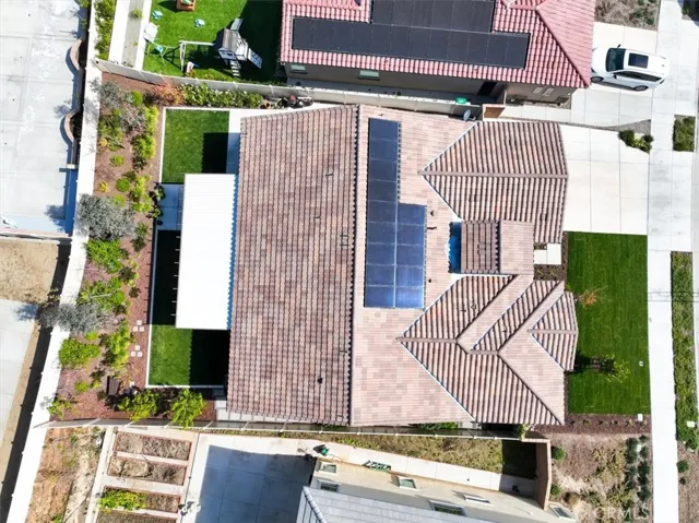 Additional highlights include a three-car tandem garage offering ample parking and storage space, along with modern upgrades throughout the home that enhance both style and convenience. Other amenities include ceiling fans, walk-in closets in secondary bedrooms, tech center currently used as a coffee bar, plantation shutters, drapes, 9 ft ceilings, integrated smart home technology and energy efficient designs to include a solar system with a battery, tankless water heater, three-car tandem garage offering ample parking and storage space, alluma=wood patio cover, professional lush landscaping, along with modern upgrades throughout the home that enhance both style and convenience