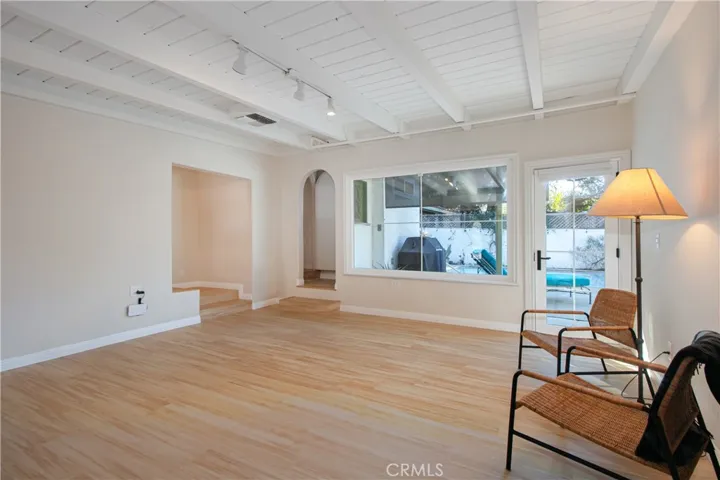The backyard captures the essence of California indoor-outdoor living with a sparkling pool, patio areas, and a private courtyard atmosphere perfect for entertaining, lounging, or enjoying warm Woodland Hills evenings.