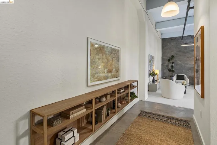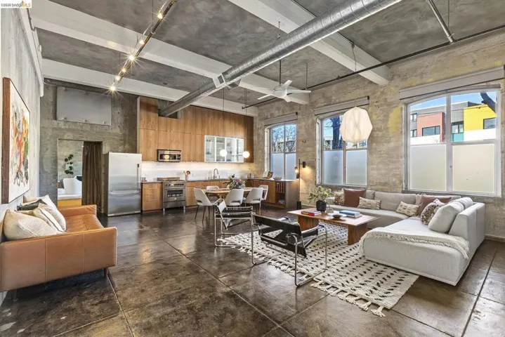 Authentic Artists loft on the Emeryville border in the historic Clawson Elementary School (1917), converted to West Clawson Lofts in 1999. This 1,733 SQ FT level-in residence blends soaring 13′ ceilings, exposed concrete, and dramatic aluminum windows that flood the space with natural light. Enter the building and see the beautiful, pressed tin ceilings, walk the halls, and the hall-gallery of residents’ work. Configured as 1 bedroom / 1 bath, the expansive open floor plan offers flexibility for creative live/work use or potential reconfiguration. The current owner utilized the space as a ceramic’s studio; a prior owner, a noted jazz musician, recorded and hosted shows. Features include concrete floors, new plush carpet in gigantic bedroom, modern kitchen with Carrara marble backsplash and walnut cabinetry, spa-like bath with tiled shower over tub, in-unit laundry, whole-home dehumidification, and abundant storage. Rare double-wide exterior doors create seamless guest or client access.Professionally managed building with secure gated parking (1 deeded space), ample visitor parking, and rooftop patios for gardening and entertaining. Near Arizmendi, Soba Ichi, Townhouse, Emeryville retail, 4 blocks to Pixar. Easy access to BART, I-80, I-580, I-880 & CA-24.