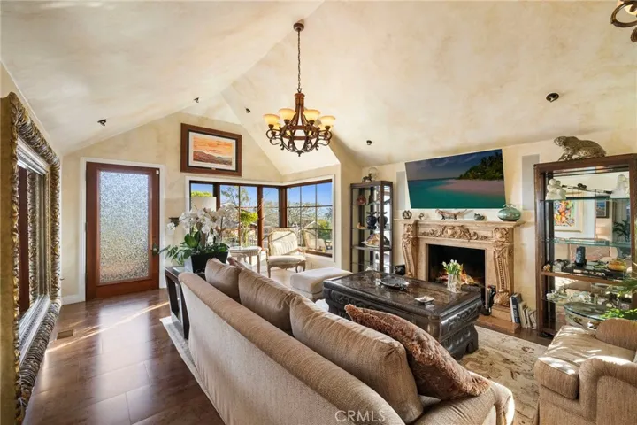 The chef’s kitchen is equipped with a Wolf dual-fuel range and convection oven, warming drawer, professional-grade appliances, wine refrigerator, and an alkaline purified water system. Spacious indoor and outdoor dining areas flow seamlessly, complemented by a bar in the ocean-view living room.