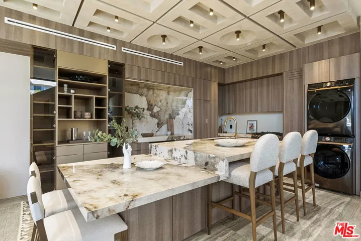 Welcome to The Corten Atelier, a one-of-one architectural residence. A never before lived in two bedroom, 2.5 bath penthouse home within the newly completed Limited Edition building, defined by a serene European stone palette, sculptural architectural detailing, and integrated modern functionality rarely found in lease offerings. The dramatic living space is anchored by a custom coffered ceiling grid with integrated bronze lighting and a waterfall quartz kitchen island wrapped in bespoke cabinetry imported from Italy and Spain. A sculptural interior staircase ascends to the private upper level where both bedrooms are positioned, establishing a rare two-level penthouse layout. Walls are finished in ceramic and floors in porcelain, with the majority of tile selections sourced from premier manufacturers in Italy, Spain, and the United Kingdom. The primary suite continues the architectural narrative with sculpted wall detailing, custom upholstered forms, and direct terrace access. The spa bath is finished in layered oxidized-tone European tile with striated textural relief and floating vanity, a boutique-hotel composition rarely seen in new lease construction. Secondary bedrooms maintain the same curated material palette and detailing. Expansive sliding glass doors extend the residence to a 127 sqft private terrace, while residents also enjoy access to a landscaped rooftop retreat featuring sculptural desert plantings including golden barrel cactus, San Pedro cactus, aloe varieties, and flowering planters, an elevated communal lounge framed by sky and city views. Delivered brand new, The Corten Atelier represents a level of architectural leasing product not previously introduced to this West Hollywood pocket. A collectible residence within the Limited Edition development defined by bespoke design, European materials, and sculptural living.