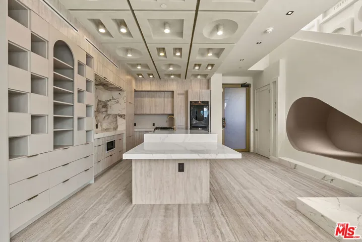 Welcome to The Dolomia Niche, a one of one architectural residence. A never before lived in two bedroom, 2.5 bath penthouse home within the newly completed Limited Edition building, defined by a serene European stone palette, sculptural architectural detailing, and integrated modern functionality rarely found in lease offerings. The main living environment is anchored by the building’s signature coffered ceiling with warm bronze lighting and a refined chef’s kitchen wrapped in bespoke European cabinetry from Italy and Spain. Quartz countertops and large-format stone surfaces create a calm, gallery like material continuity throughout. Expansive sliding glass doors extend the residence to a 129 sqft private terrace. A sculptural interior staircase ascends to the private upper level where both bedrooms are positioned, establishing a rare two level penthouse layout. Walls are finished in ceramic and floors in porcelain, with the majority of tile selections sourced from premier manufacturers in Italy, Spain, and the United Kingdom. A defining architectural feature of the residence is the custom sculpted niche, a one of a kind built in retreat designed as a media alcove, reading lounge, or creative workspace. This signature moment introduces a sense of depth, personality, and spatial sculpture unique to this home within the Limited Edition collection. The primary suite is paired with a spa bath finished in large-format European tile from the Dolomia and Dehor collections, arranged in a geometric stone composition with warm neutral tones, floating double vanity, and modern matte black fixtures. Secondary baths continue the same refined material language with sculptural lighting and clean architectural lines. Residents also enjoy access to a landscaped rooftop retreat featuring sculptural desert plantings including golden barrel cactus, San Pedro cactus, prickly pear, aloe varieties, and flowering planters, an elevated communal lounge framed by sky and city outlooks. Delivered brand new, The Dolomia Niche represents a level of architectural leasing product not previously introduced to this West Hollywood pocket. A collectible residence within the Limited Edition development defined by bespoke design, European materials, and sculptural living.