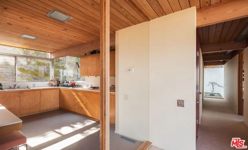 A flawless restoration of Richard Neutra, FAIA :: The Linn Residence, 1961. Sits on a secluded promontory perched, above the legendary Mulholland Drive in the Hollywood Hills, with explosive views of the Valley and the San Gabriel Mountain range. Neutra lifts the main level above the site and over the carport and a separate guest quarters to further enhance the views. This second level consists of a living area divided by a hearth, newly restored kitchen, ensuite primary with bath, guest bath, two bedrooms separated by a collapsible wall, and the red room sauna. The grounds include terraces, decks, private pool, and gated drive. Absolutely everything impeccably restored.