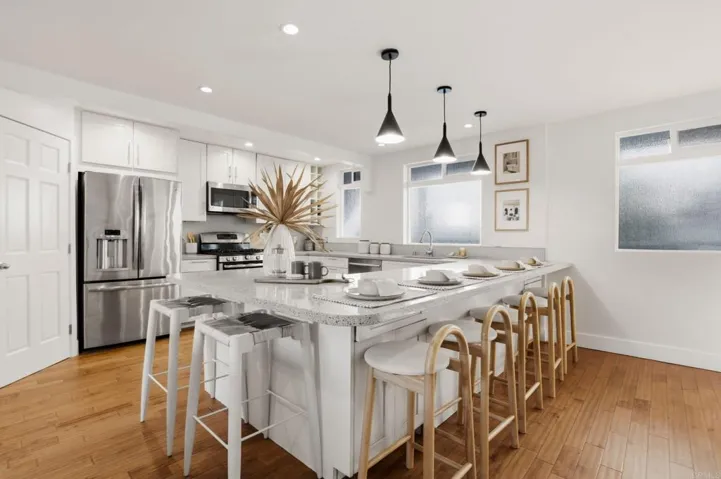 Wake up to salt air and the sound of waves just a block away. This beautifully reimagined coastal retreat sits in the beating heart of Ocean Beach — one of San Diego’s most beloved and authentically eclectic beach communities — where the pier, the sand, and the vibrant energy of Newport Avenue are all part of your daily life. Step inside and an airy, light-filled living space welcomes you with warm hardwood floors flowing through an open-concept layout. The living room features a stone-surround fireplace and oversized sliding glass doors that open to a private patio (the only one in the building), blurring the line between indoor and outdoor living. The kitchen is a showstopper — a generous peninsula with seating for six beneath modern pendant lights, surrounded by white shaker cabinetry, quartz countertops, stainless steel appliances, and a glass tile backsplash. It’s a space built for hosting, whether you’re plating tacos after a sunset surf or pouring wine for a dinner party. Three serene bedrooms offer thoughtful retreats — the primary with palm-framed views, the second and third bathed in skylight. Both bathrooms feature marble-style countertops, warm wood vanities, matte black fixtures, and elegant tilework, including a walk-in glass shower and a separate tub-shower combo. But the real magic is the address. One block to the sand, steps to the OB Pier, surrounded by the farmers market, surf shops, beloved restaurants, and the kind of neighborhood character that can’t be replicated. Ocean Beach isn’t just a location — it’s a lifestyle. This is your chance to own a piece of one of California’s last true beach towns. Welcome home.