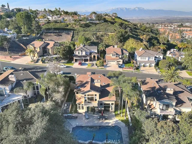 Beautiful, highly upgraded Corona 4 bedroom, 4 bath home with a resort-style backyard featuring a pool, spa, barbecue island, and firepit. The home was built in a terraced fashion, which offers a high degree of privacy from the neighbors. Offering 3,060 square feet of living space on a 10,019 square foot lot (per tax roll), this property impresses inside and out. Front and rear hardscaping includes flagstone decking and stacked rock accents that elevate curb appeal from the moment you arrive. The open floor plan is filled with natural light and finished in a designer color palette. Soaring ceilings welcome you into the formal living room. A dual-sided fireplace connects the formal dining and family rooms, creating warmth for entertaining or relaxing evenings. The well-designed kitchen features furniture-grade wood cabinetry, granite counters, travertine flooring, stainless steel appliances, recessed lighting, a pantry, a center island, a breakfast bar, and a spacious breakfast nook for casual dining. The primary suite is exceptional. A dual-sided fireplace serves both the bedroom and private retreat, ideal for a home office or reading lounge. A balcony off the retreat overlooks the backyard. The en-suite bath offers a dual sink vanity, walk-in shower, soaking tub, and large walk-in closet with built-ins. Upstairs includes two guest bedrooms, each with its own en-suite bath. A main-level bedroom and full bath provide flexibility for guests or multigenerational living. The first floor also features an indoor laundry room with extra storage. The private backyard has no rear neighbor and mature greenery for a serene backdrop. Enjoy the spa year-round, pool in summer, firepit seating area, and stacked rock barbecue island with ample counter space for serving. A large three-car garage and generous driveway parking complete the home. This one delivers on space, upgrades, privacy, and outdoor living. This home is move in ready to enjoy!