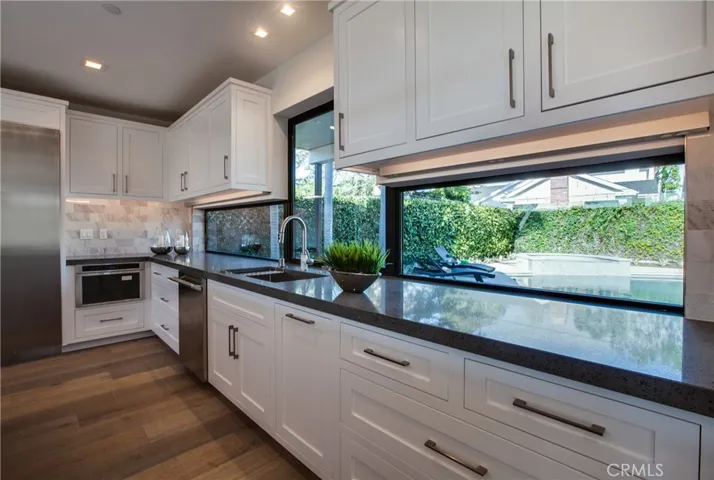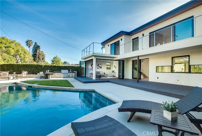yard and deck. A 6 foot wide glass entry door leads you into the large open concept designed great room with large living and dining areas and chef’s kitchen. The over-sized island with commercial grade stove, stainless steel appliances, and wine station looks out to the festive back yard and to the main living room and dining area with contemporary fireplace. A game room is open to the main rooms while disappearing glass doors open onto the large back yard…ready for fun in the salt water pool and spa with wireless control, built in BBQ with a granite buffet table adjacent to the firepit. Fully wired for a scalable audio/video/security system, this home includes a powder room and one bedroom suite on the main floor while the upstairs includes a large primary suite with fireplace and opens to a private deck over looking the pool. Three additional bedroom suites along with a laundry area round out the upper level. The home totals 5 bedroom suites (including one secondary bedroom with private stair case and deck, 5.5 baths, spacious great room, and game room. Designed for entertaining a crowd with easy indoor/outdoor living, this property is ready for summer fun.