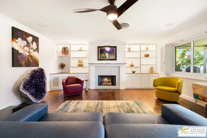 Beautifully renovated and completely dialed in, this 3-bedroom 2-bathroom residence with an open floor plan shows like a model in sought-after Movie Colony East. Walled and private with mature landscaping including a lemon tree, this desert escape blends designer finishes, thoughtful upgrades, and effortless indoor-outdoor living. Three distinct outdoor areas set the tone, including the enclosed east-facing front yard with gated entry and classic tiled porch, a south-facing side yard with covered patio, custom-built bar, outdoor kitchen with stainless drawers, Alfresco grill, Kamado smoker and fire pit, and an ultra-private west-facing backyard featuring a swim spa style lap pool and stunning Mt. San Jacinto views. Inside, wood flooring runs throughout the light-filled living areas where a gas fireplace framed by custom built-ins anchors the living room. The showcase kitchen offers counter seating, stylish finishes, soft-close cabinetry and drawers, and excellent flow into the adjacent dining area where a generous buffet and two sets of French doors open beautifully to the covered patio and mountain views. The primary suite is a true retreat with clerestory windows, striking tile work, a deep soaking bubble tub, and separate walk-in shower. Guest bedrooms Two and Three are positioned near a beautifully appointed hall bath with multi-jetted shower. Additional upgrades include a new foam and elastomeric roof completed in 2026, tankless water heater, and an air-conditioned 2 car garage with epoxy flooring, California Closets storage and workshop space. No monthly HOA and no land lease. Just moments from the best of downtown Palm Springs.