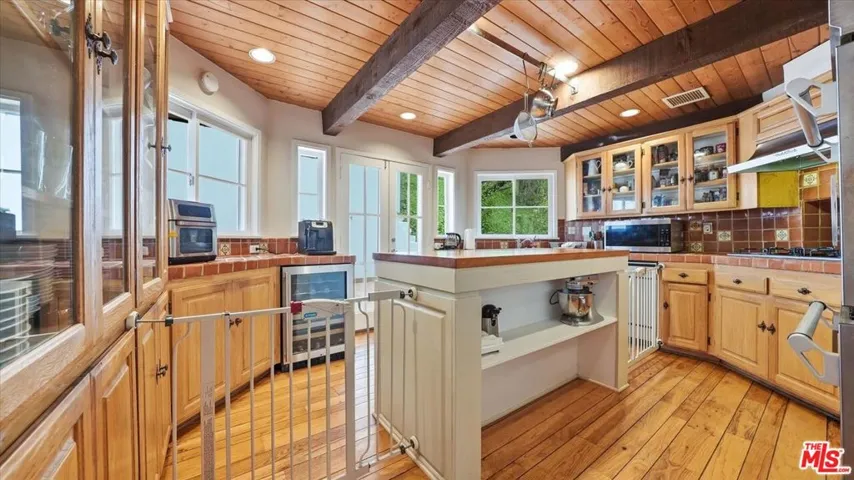 Tucked into the serene hills of BHPO just moments from Benedict Canyon, this charming Cape Cod inspired retreat offers privacy and character. Sunlight fills the open, multi-level layout, highlighting vaulted ceilings, graceful arches, and thoughtful architectural details throughout. A blend of Spanish warmth and classic design is showcased through Saltillo tile floors, exposed wood beams, and timeless finishes. The home spans approximately 2,309 square feet and features two bedrooms plus a versatile den or office that can easily serve as a third bedroom, along with two bathrooms and a loft-style living room anchored by a cozy fireplace. The kitchen is equipped with stainless steel appliances and a center island, flowing seamlessly into the dining area. French doors open to a spacious, private patio – an ideal setting for entertaining or unwinding under the stars. The primary suite occupies the entire upper level, offering a romantic escape with a fireplace, vaulted beamed ceilings, arched windows, and peaceful treetop views. A cedar-lined walk-in closet and a spa-like bathroom featuring custom cabinetry and slate finishes complete the experience. An enclosed private two-car garage provides secure parking and added convenience. A peaceful hillside sanctuary just minutes from the heart of Beverly Hills.